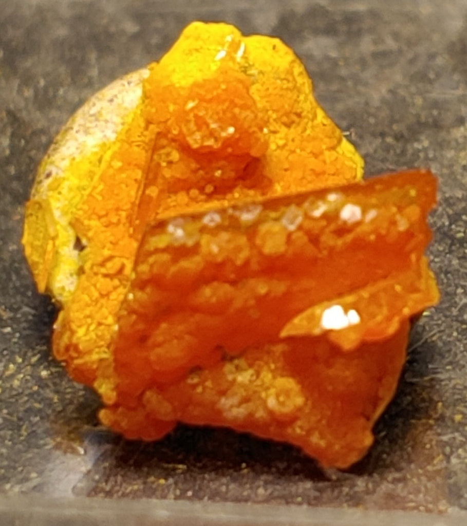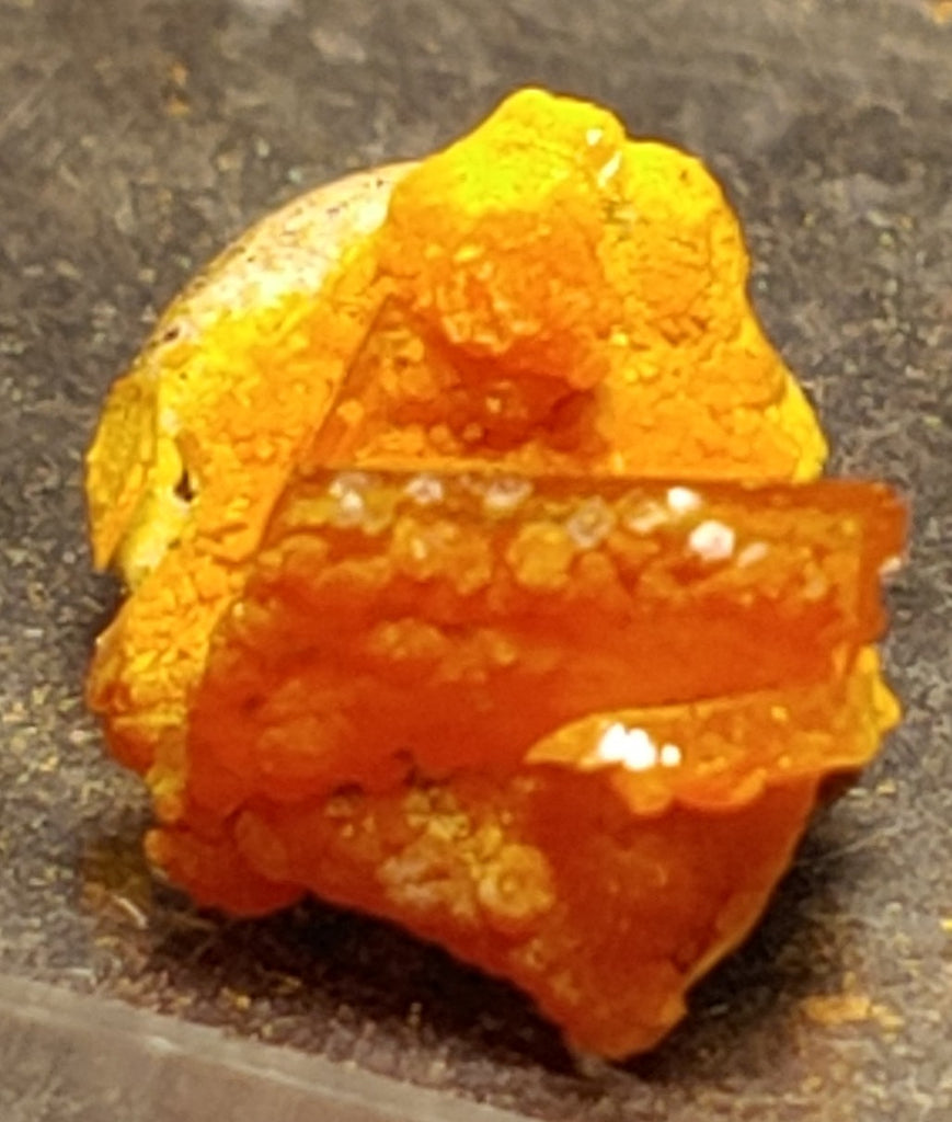 Wulfenite and Mimetite from Rowley Mine, Maricopa County, Arizona. Measures  1.1 x 0.8 x 0.6 cm. Comes in a clear plastic case for viewing. Stock #4074 Free Combined Shipping.